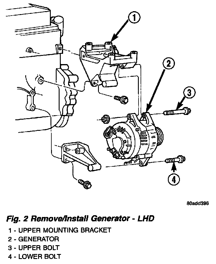 3. Left Hand Drive (LHD) Vehicles Only: Remove generator pivot and mounting bolts/nut (Fig. 2). Position generator for access to wire connectors.