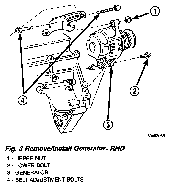 4. Right Hand Drive (RHD) Vehicles Only: Remove upper nut (generator adjustment nut) and both belt adjustment bolts (Fig. 3). Remove generator lower nut/bolt. Position generator for access to wire connectors.