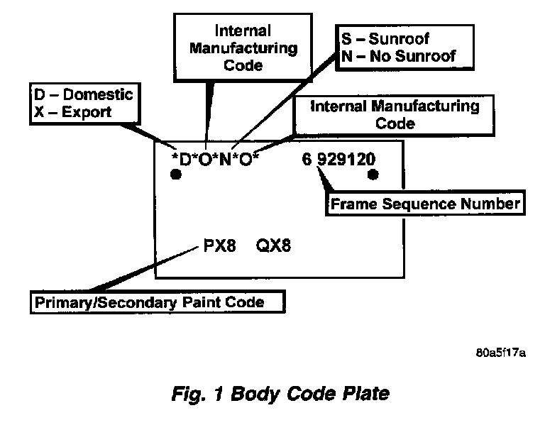A metal Body Code plate is located in the engine compartment and attached to the top of the right