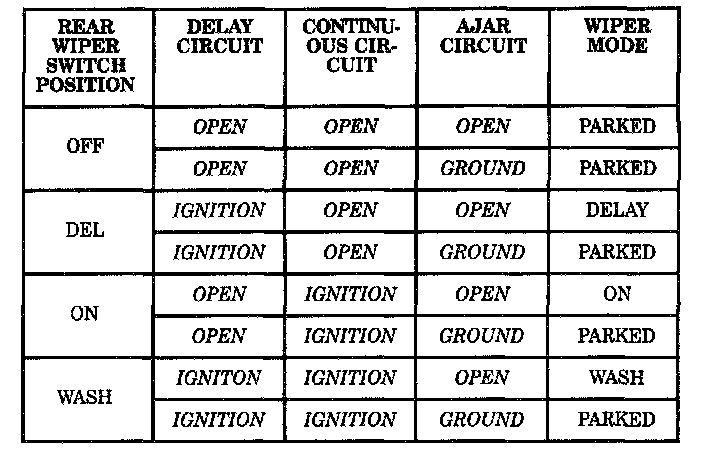 Two of these circuits come from the rear wiper switch on the right multi-function switch stalk. These circuits are referred to as the rear wiper motor control circuit and the rear wiper motor intermittent control circuit. When the rear wiper switch is in the OFF position, both of these circuits are open and the wiper module parks or remains parked. When the rear wiper switch is in the Intermittent position, the intermittent control circuit is switched to ignition voltage, the motor control circuit is open and the wiper is in the intermit- tent modes. When the rear wiper switch is in the ON position, the intermittent control circuit is open and the motor control circuit is switched to ignition voltage and the wiper is in continuous wipe mode.