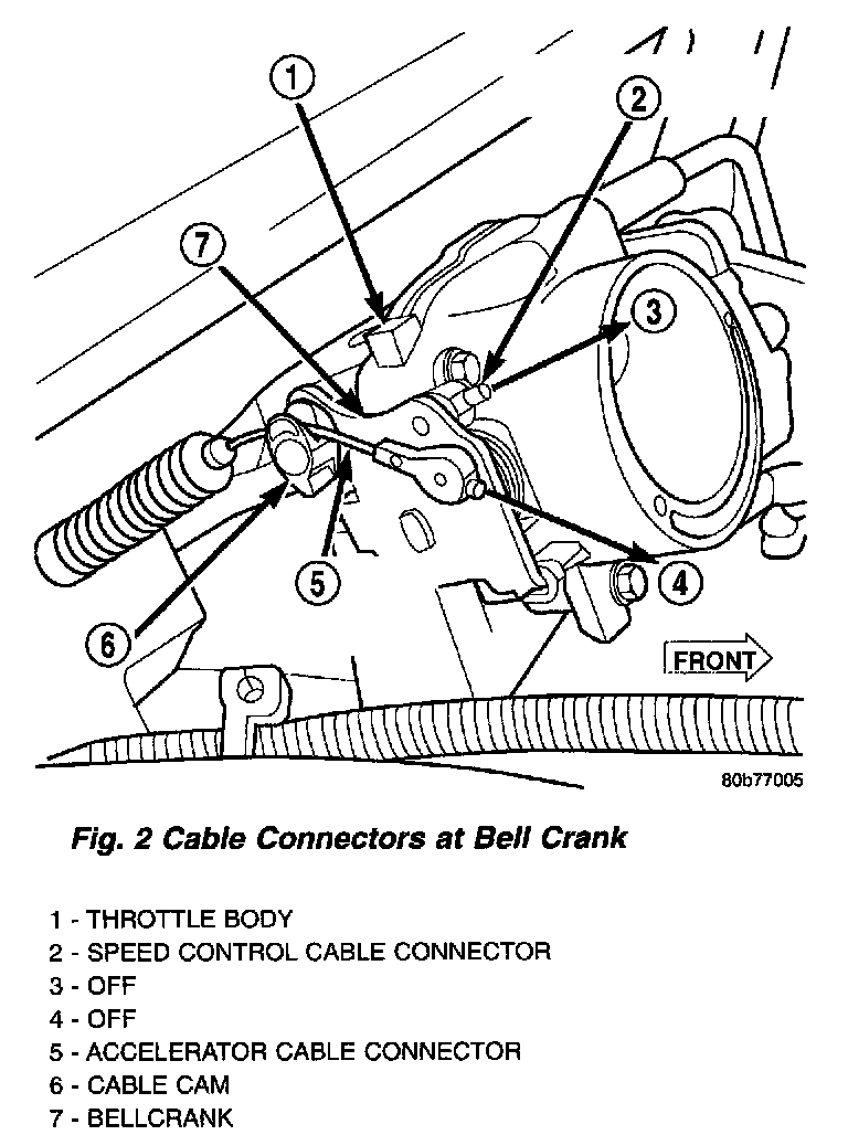 6. Using finger pressure only, disconnect speed control cable connector at throttle body bellcrank pin by pushing connector OFF bellcrank pin towards front of vehicle. DO NOT try to pull connector OFF perpendicular to the bellcrank pin. Connector will be broken.