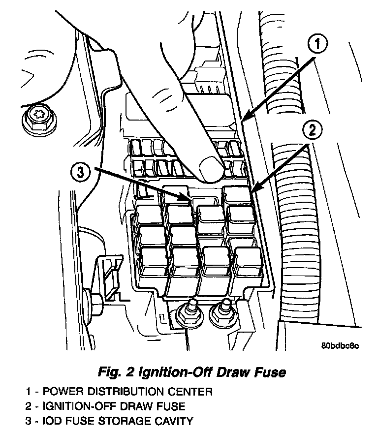 All vehicles are equipped with an Ignition-Off Draw (IOD) fuse (Fig. 2) that is removed from its cavity in the Power Distribution Center (PDC) when the vehicle is shipped from the factory. Dealer personnel are to remove the IOD fuse from the storage location and install it into PDC fuse cavity 15 as part of the preparation procedures performed just prior to new vehicle delivery.
