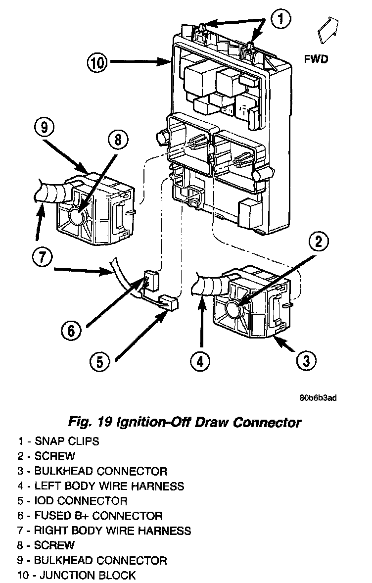 All vehicles are equipped with an Ignition-Off Draw (IOD) connector that is located in a molded connector receptacle on the lower rear surface of the Junction Block (JB) housing (Fig. 19). The JB is concealed above the molded plastic instrument panel fuse cover. Integral latches molded into the fuse cover secure it the JB, the Body Control Module (BCM) and the 16-way data link connector tab of the instrument panel steering column support bracket. The fuse cover can be pulled downward to disengage the latches and provide service access to all of the fuses, relays and wire harness connectors of the JB.