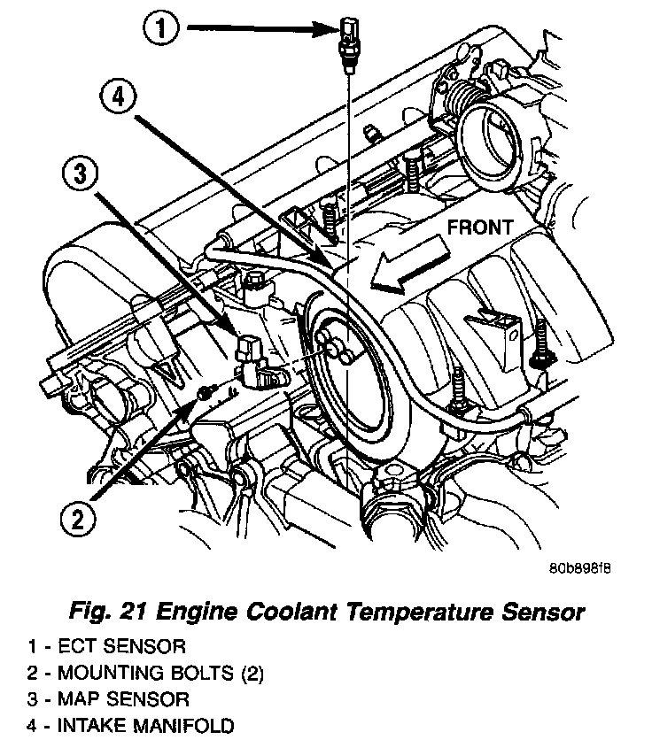 The ECT sensor is located near the front of the intake manifold.