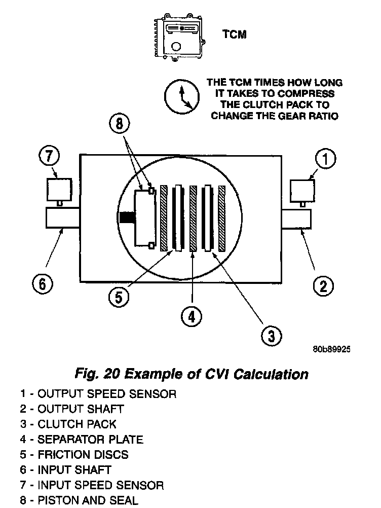 By comparing the two inputs, the TCM can determine transmission gear position. This is important to the CVI calculation because the TCM determines CVIs by monitoring how long it takes for a gear change to occur (Fig. 20).