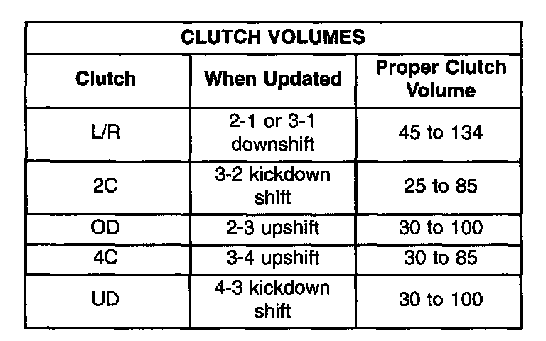 Certain mechanical problems within the input clutch assembly (broken return springs, out of position snap rings, excessive clutch pack clearance, improper assembly, etc.) can cause inadequate or out-of-range element volumes. Also, defective Input/Out-put Speed Sensors and wiring can cause these conditions. The following chart identifies the appropriate clutch volumes and when they are monitored/updated: