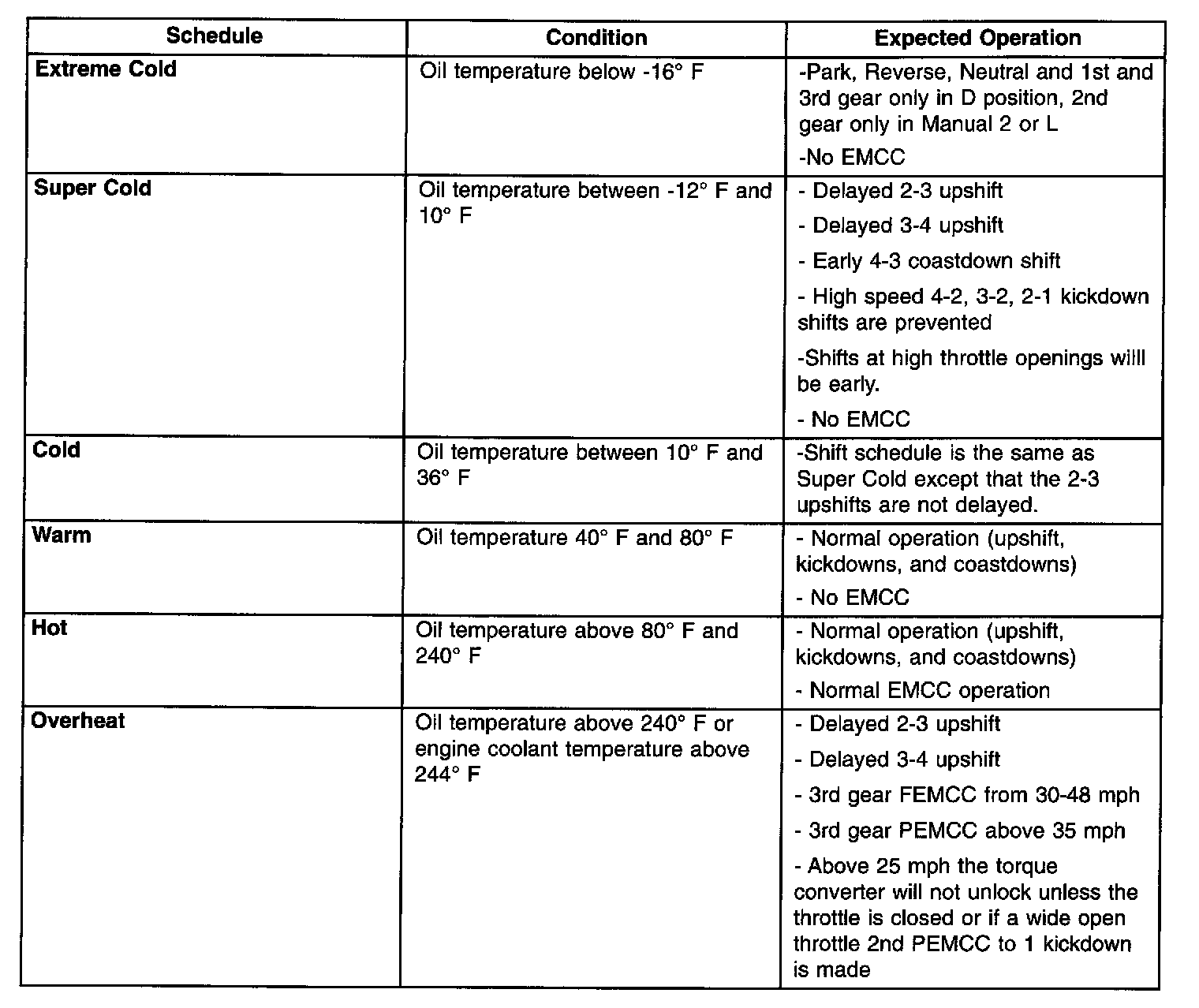 As driving conditions change, the TCM appropriately adjusts the shift schedule. Refer to the following chart to determine the appropriate operation expected, depending on driving conditions.