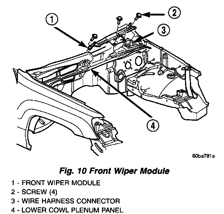 The front wiper module is secured with four screws through rubber isolators to the cowl plenum panel beneath the cowl plenum cover/grille panel. The ends of the wiper pivot shafts that protrude through dedicated openings in the cowl plenum cover/grille panel to drive the wiper arms and blades are the only visible components of the front wiper module. The front wiper module consists of the following major components: