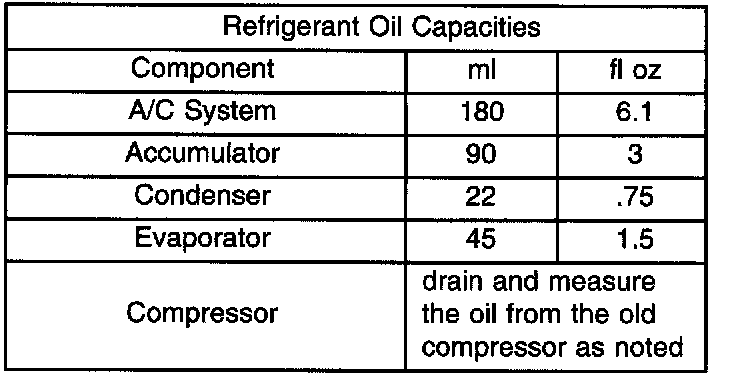 Refrigerant oil must be added when a accumulator, evaporator coil, or condenser are replaced. See the Refrigerant Oil Capacities chart. When a compressor is replaced, the refrigerant oil must be drained from the old compressor and measured. Drain all of the refrigerant oil from the new compressor, then fill the new compressor with the same amount of refrigerant oil that was drained out of the old compressor.