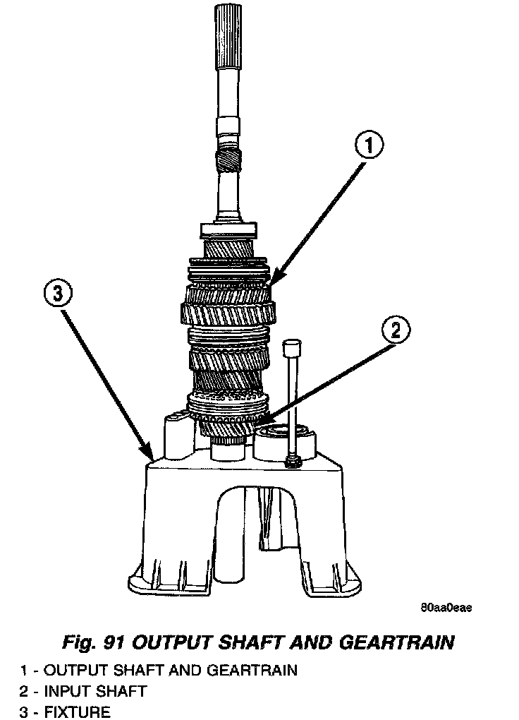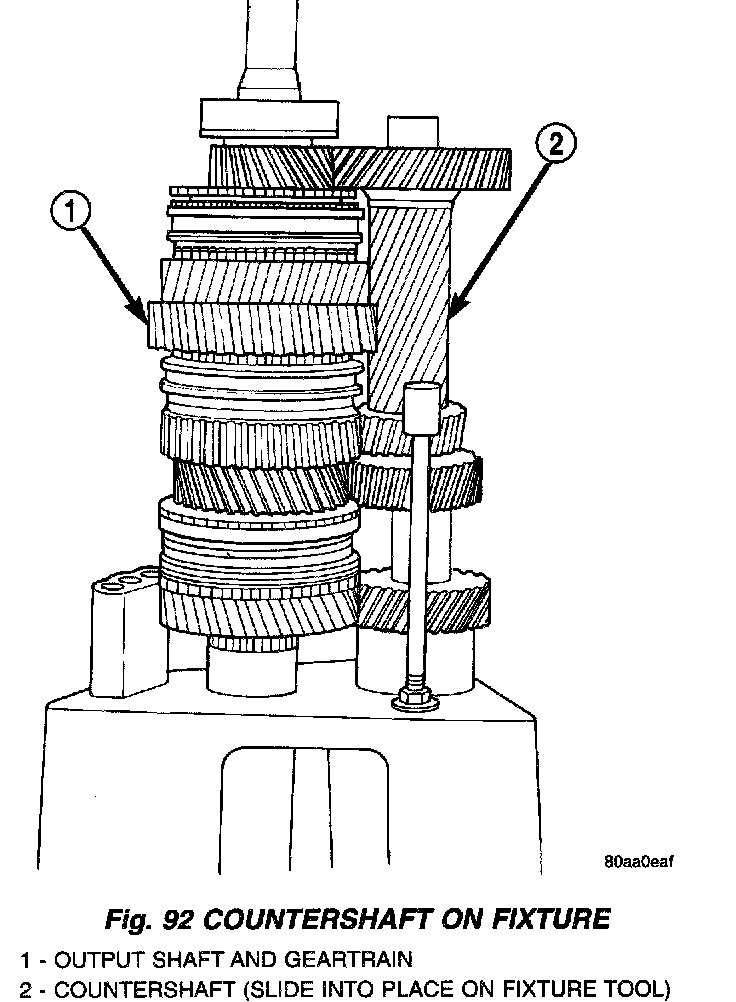 8. Slide countershaft (and adapter) into fixture slot. Verify countershaft and output shaft gears are fully meshed with the mainshaft gears (Fig. 92).