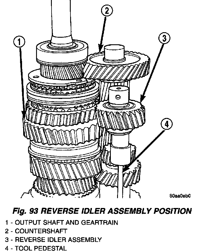 10. Position reverse idler in support cup of assembly fixture (Fig. 93). Ensure idler gear is properly meshed and aligned with shaft gear teeth and that bolt holes are facing out and not toward geartrain. Adjust pedestal up or down if necessary. Also be sure that short end of idler shaft is facing up as shown.