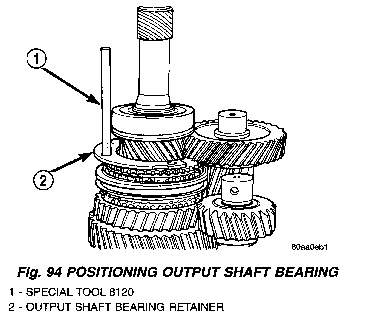 11. On 2-wheel drive transmission, thread one Alignment Pin 8120 in center or passenger side hole of output shaft bearing retainer. Then position retainer on fifth gear as shown (Fig. 94).