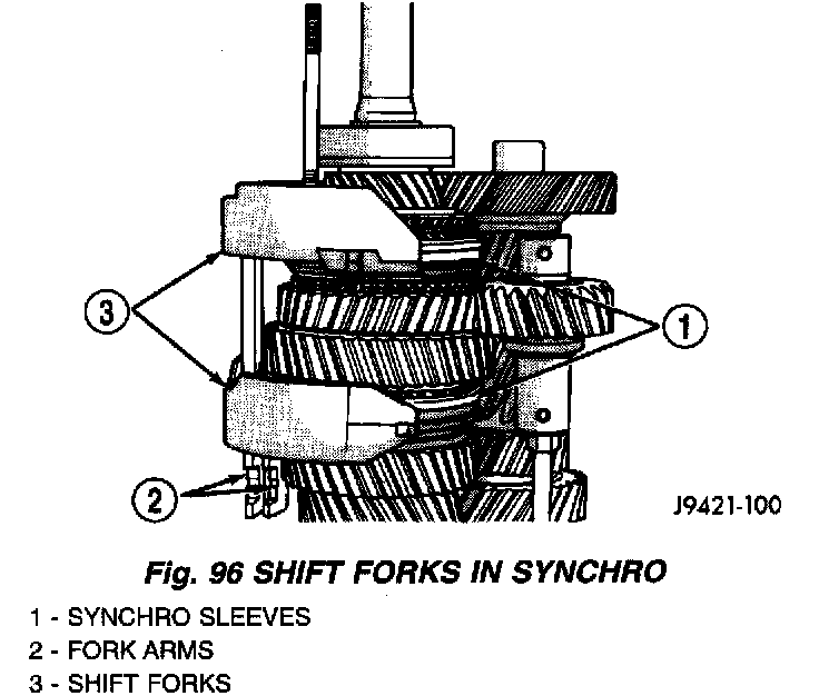 13. Install assembled shift forks in synchro, sleeves (Fig. 96). Verify forks are properly seated in sleeves.