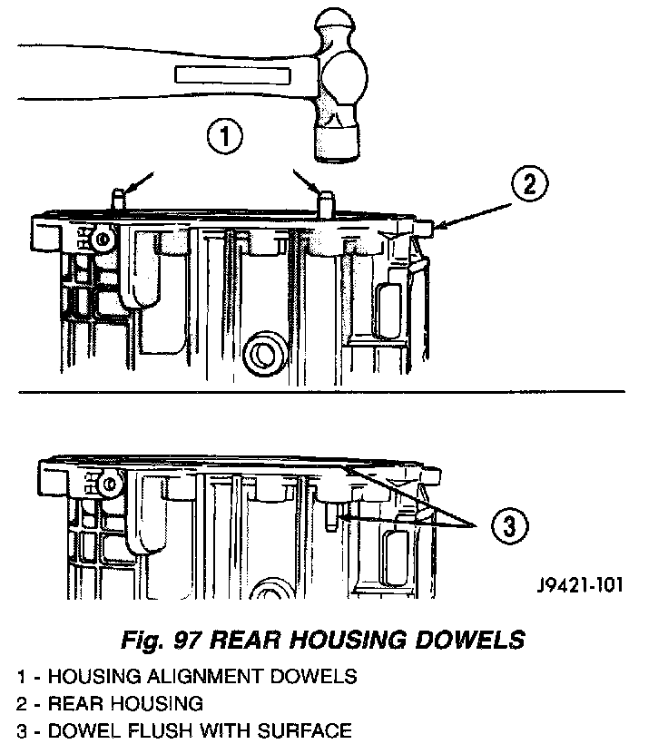 1. Drive adapter housing alignment dowels back into housing until dowels are flush with mounting surface (Fig. 97).