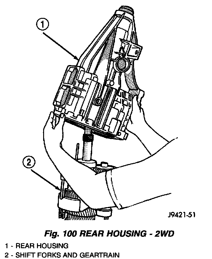 7. Install rear housing onto geartrain (Fig. 100). Verify bearing retainer pilot stud is in correct bolt hole in housing. Also be sure countershaft; and output shaft bearings are aligned in housing and on countershaft. It may be necessary to lift upward on countershaft slightly to ensure that the countershaft rear bearing engages to the countershaft before the rear output shaft bearing engages the housing.