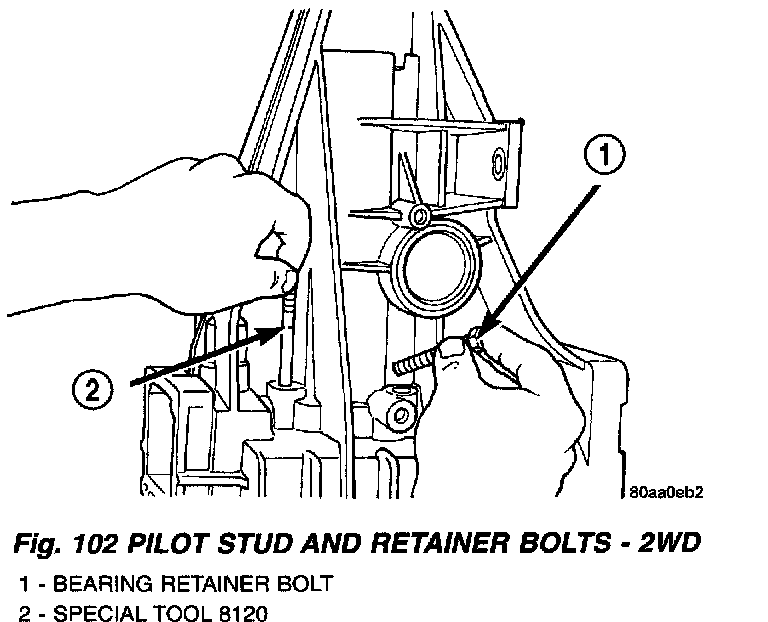 10. Start first two bolts in retainer (Fig. 102). It may be necessary to move retainer rearward (with pilot stud) in order to start bolts in retainer.