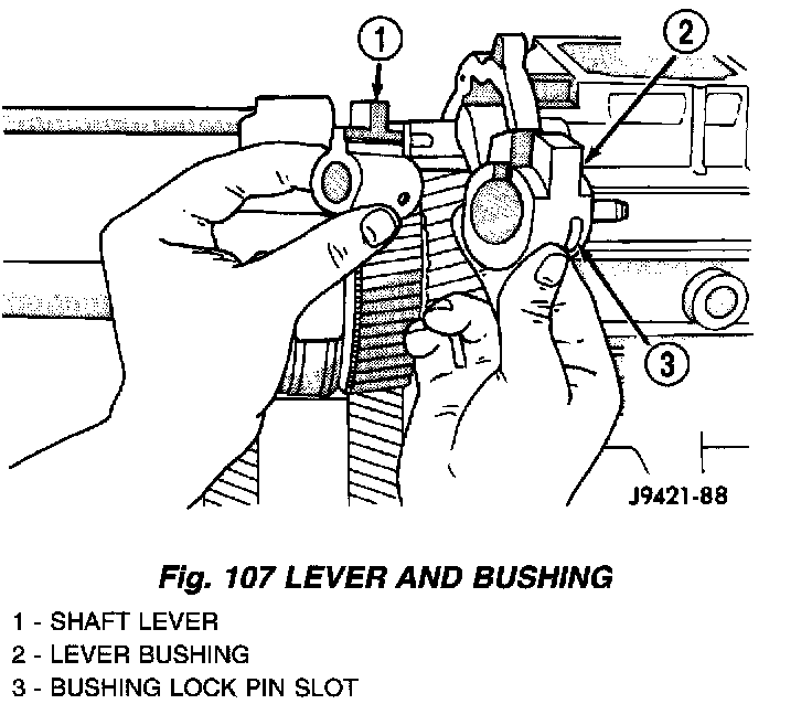 4. Assemble shift shaft shift lever and bushing (Fig. 107). Be sure slot in bushing is facing up and roll pin hole for lever is aligned with hole in shaft.