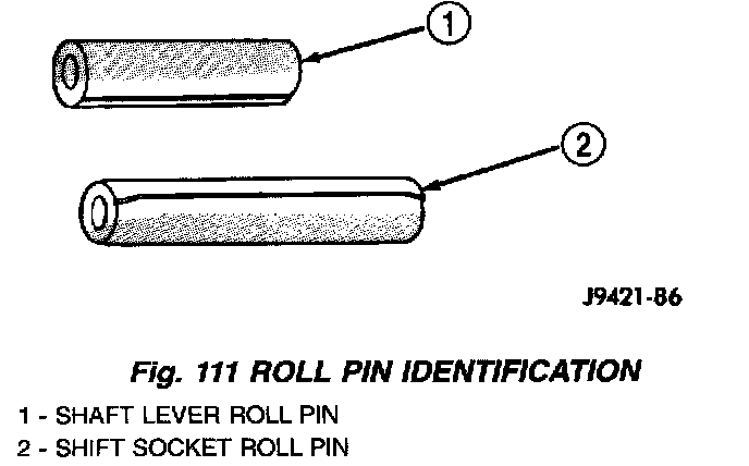 9. Select correct new roll pin for shift shaft lever (Fig. 111). Shaft lever roll pin is approximately 22 mm (7/8 inch) long. Shift socket roll pin is approximately 33 mm (1-1/4 inch) long.