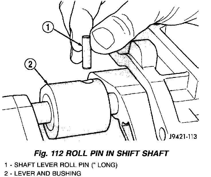 10. Align roll pin holes in shift shaft, lever and bushing. Then start roll pin into shaft lever by hand (Fig. 112).
