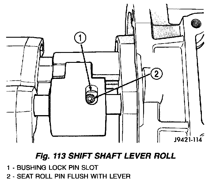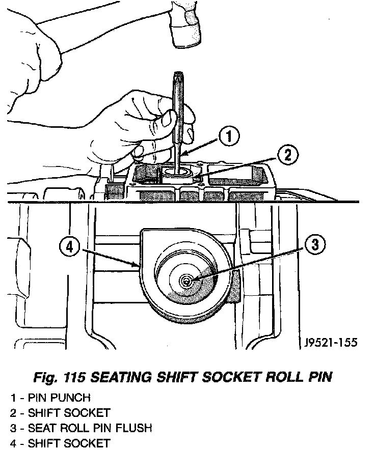 14. Seat roll pin in shift socket with pin punch. Roll pin must be flush with socket (Fig. 115).
