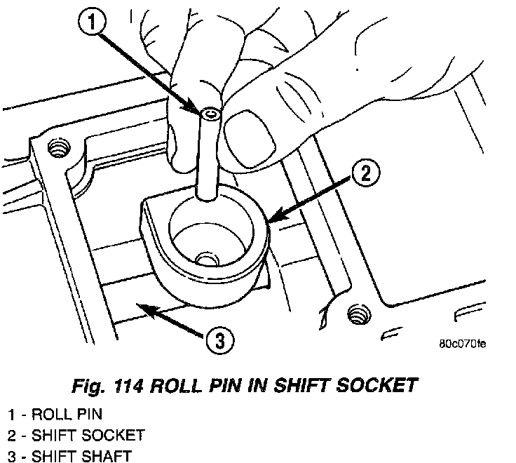 13. Align roll pin holes in shift socket and shift shaft. Then start roll pin into shift shaft by hand (Fig. 114).