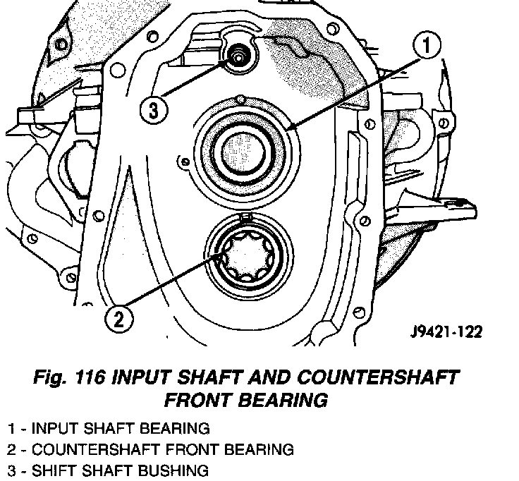 2. If previously removed, input shaft bearing in front housing (Fig. 116). Install snap ring and use plastic mallet to seat bearing. Bearing goes in from front side of housing only.