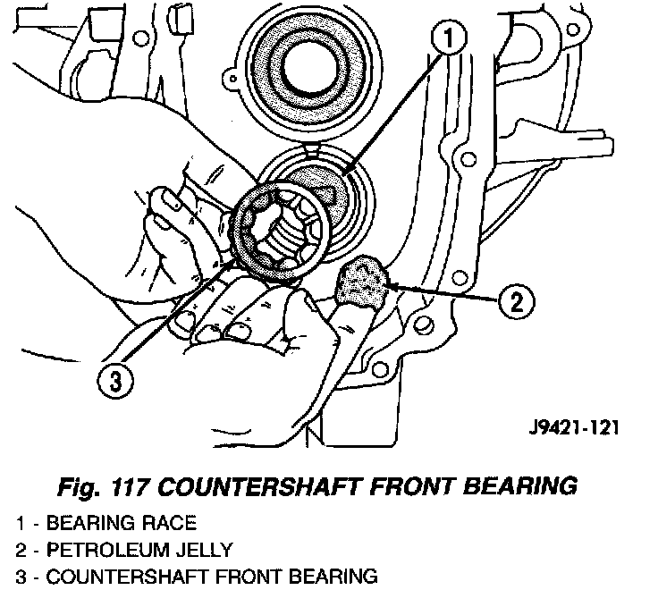 2. Apply liberal quantity of petroleum jelly to countershaft; rear bearing and bearing race.