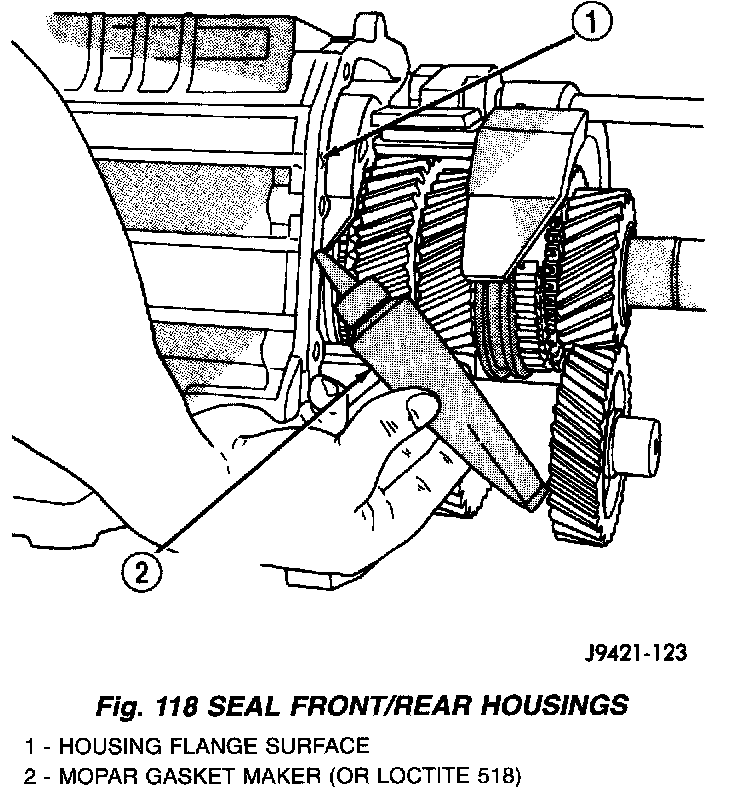 6. Apply 1/8 inch wide bead of Mopar Gasket Maker or equivalent, to mating surfaces of front and rear housings (Fig. 118).
