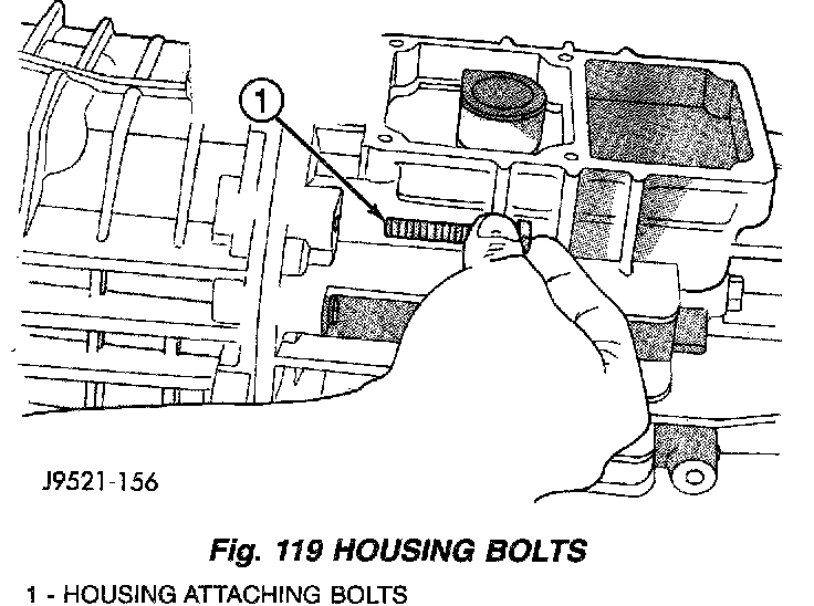 11. Apply Mopar Gasket Maker or equivalent to housing attaching bolts. Apply sealer material sealer to underside of bolt heads and to bolt shanks and threads (Fig. 119).