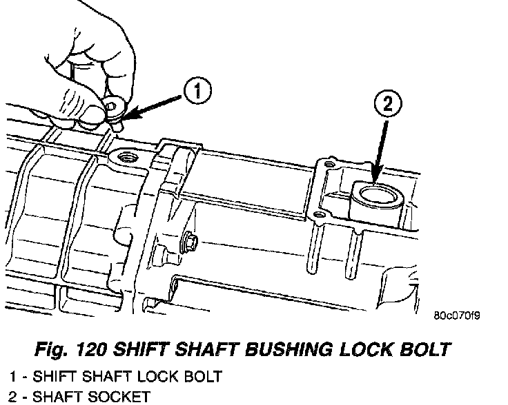 13. Install shift shaft bushing lock bolt (Fig. 120). Apply Mopar Gasket Maker or equivalent, to bolt threads, shank and underside of bolt head before installation.