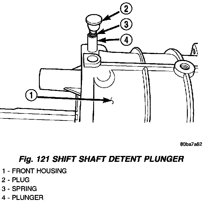 14. Lubricate then install shift shaft detent plunger in housing bore (Fig. 121). Lubricate plunger with petroleum jelly or gear lubricant. Verify plunger is fully seated in detent notch in shift shaft.