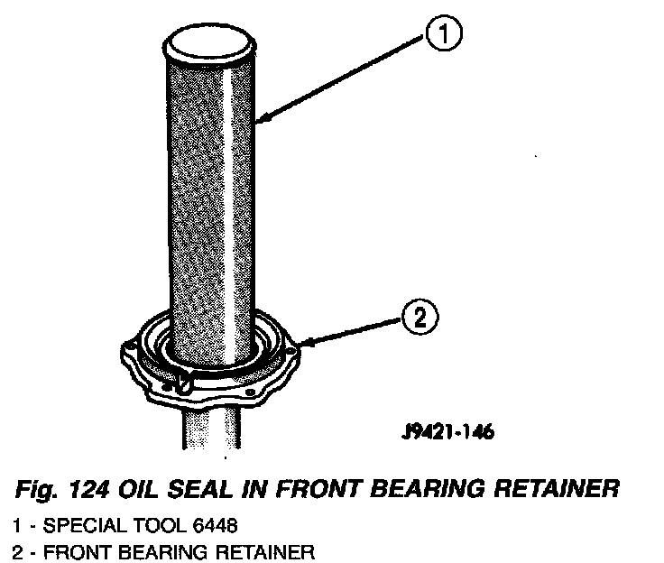19. Install new oil seal in front bearing retainer with Installer 6448 (Fig. 124).