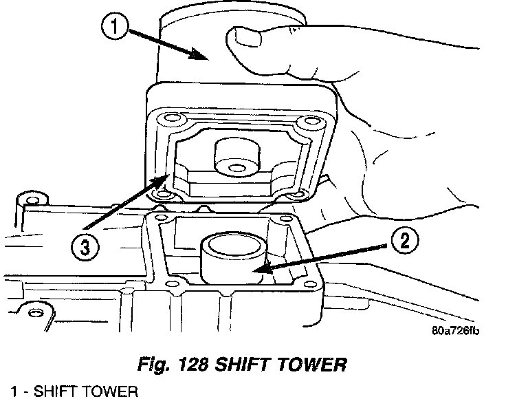3. Align and install shift tower and lever assembly (Fig. 128). Be sure shift ball is seated in socket and the offset in the tower is toward the passenger side of the vehicle before installing tower bolts.