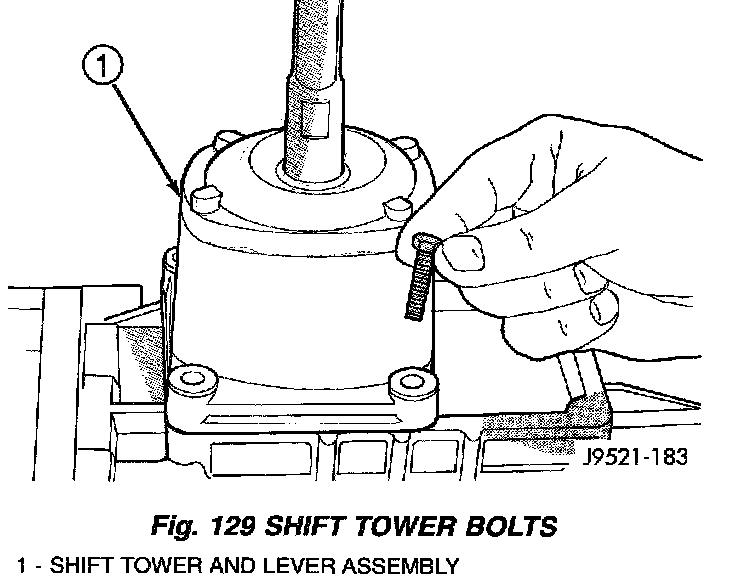 4. Install shift tower bolts (Fig. 129). Tighten bolts to 8.5 Nm (75.2 inch lbs.).