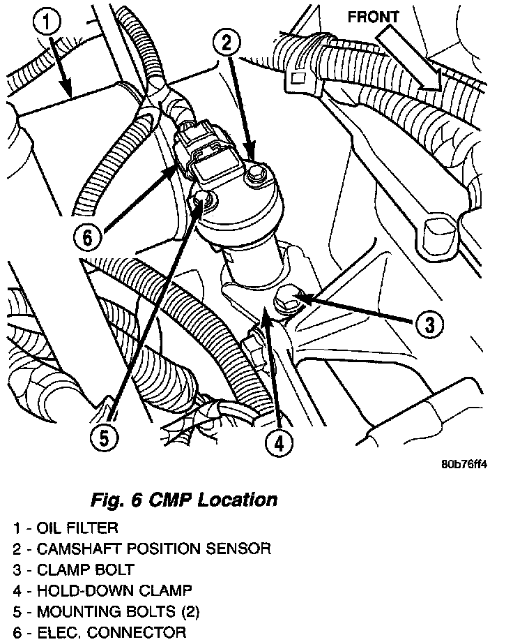 The Camshaft Position Sensor (CMP) on this engine is bolted to the top of the oil pump drive shaft assembly. The sensor and drive shaft assembly is located on the right side of the engine near the oil filter.
