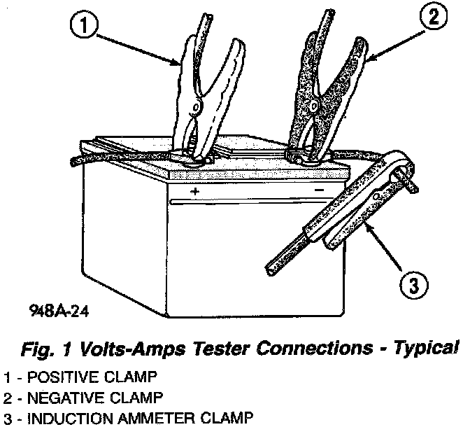 1. Connect a suitable volt-ampere tester to the battery terminals (Fig. 1). See the instructions provided by the manufacturer of the volt-ampere tester being used.