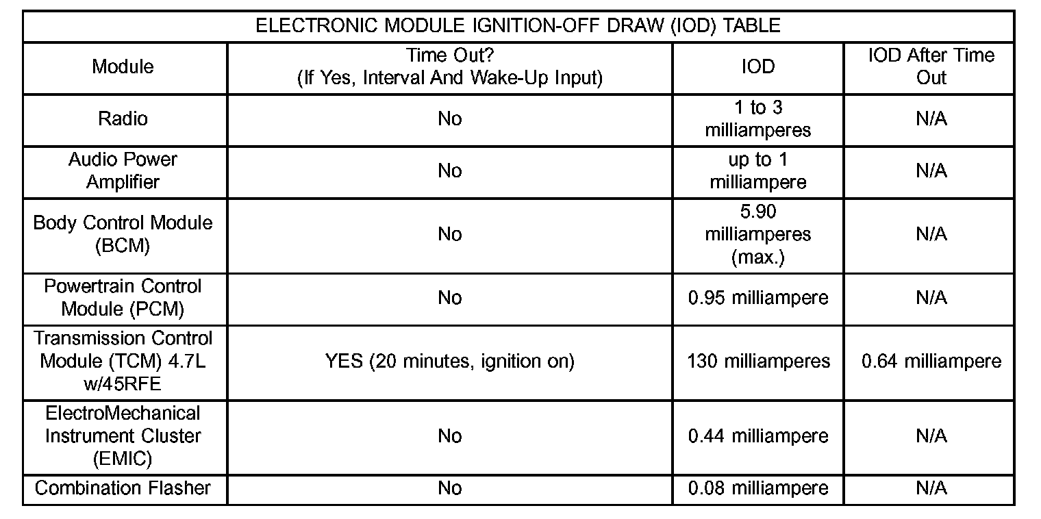 Electronic Module Ignition-Off Draw (IOD) Table: