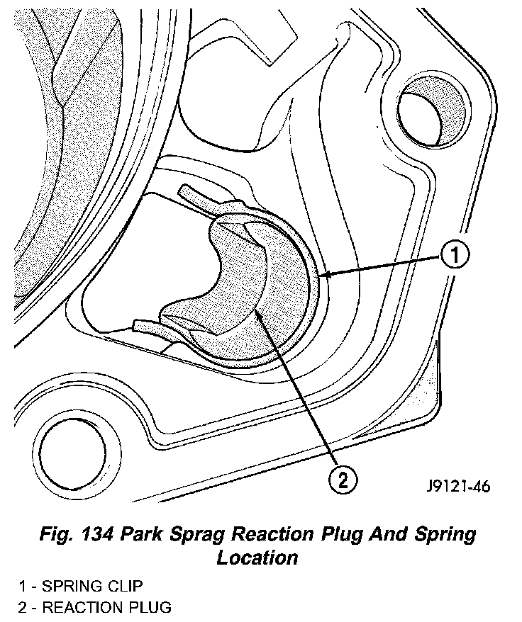 Examine the park lock components in the housing. If replacement is necessary, remove the shaft with parallel jaw snap-ring pliers (Fig. 133) and remove the sprag and spring. Then remove the spring clip and reaction plug (Fig. 134). Compress the reaction plug spring clip only enough to remove and install it. Do not distort the clip during removal or installation.