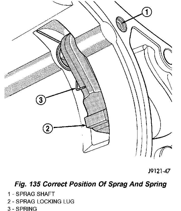 Be sure a replacement sprag is installed so the sprag locking lug will face the park gear (Fig. 135). Also be sure the spring is correctly positioned as shown (Fig. 135). The sprag may not retract if the spring is improperly installed.