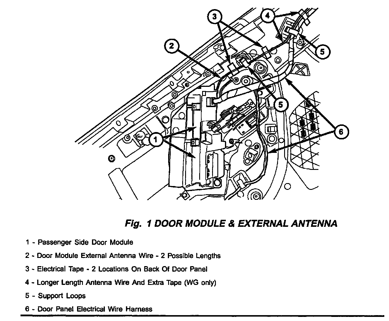This bulletin involves the installation of a new passenger side door module that now includes an added external antenna wire.