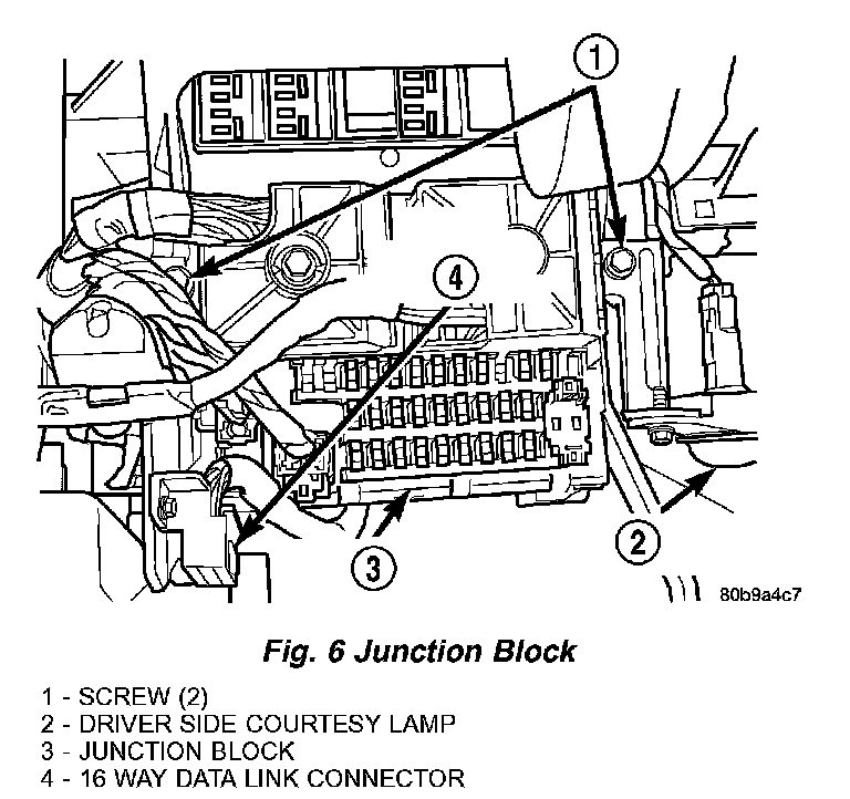 NOTE: If the Junction Block (JB) is being replaced with a new unit, be certain to transfer each of the optional fuses, circuit breakers and relays from the faulty JB to the proper cavities of the replacement JB. Refer to Junction Block in Wiring Diagrams for the location of complete circuit diagrams and cavity assignments for the JB. The Body Control Module (BCM) must also be transferred to the new JB. Refer to Body Control Module in Electronic Control Modules for the location of the BCM removal and installation procedures.