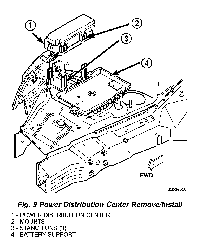 8. Disengage the latches on the PDC housing mounts from the tabs on the PDC mounting stanchions of the battery support, and pull the PDC housing upward to disengage the mounts from the stanchions (Fig. 9).