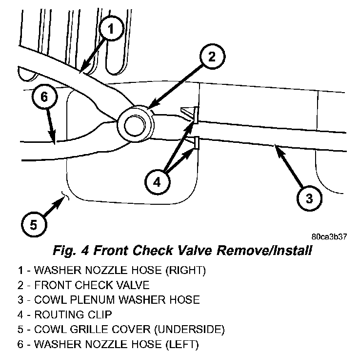 1. Position the front check valve to the underside of the cowl plenum cover/grille panel. Be certain that the flow direction arrow molded into the front check valve body is oriented towards the front washer nozzles.