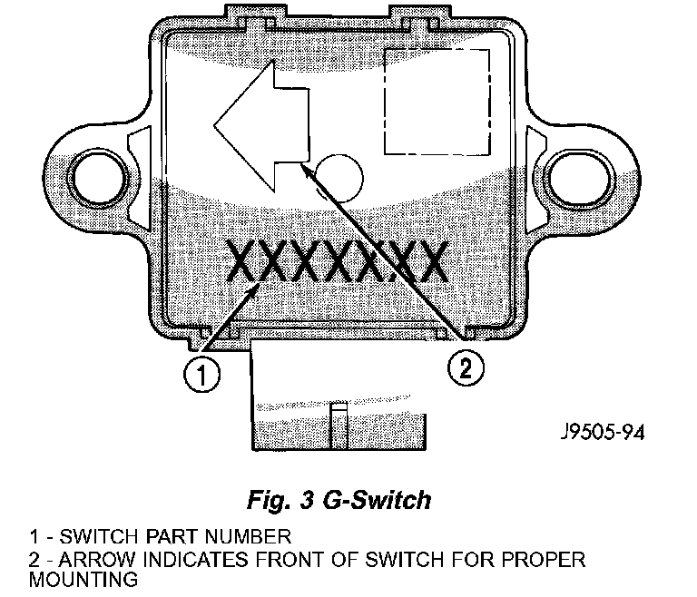 CAUTION: The mercury switch (inside the G-switch), will not function properly if the switch is installed incorrectly. Verify that the switch locating arrow is pointing to the front of the vehicle.