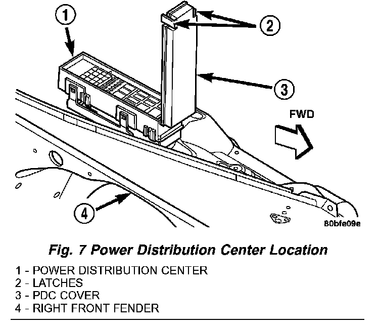 All of the electrical current distributed throughout this vehicle is directed through the standard equipment Power Distribution Center (PDC) (Fig. 7). The molded plastic PDC housing is located on the right side of the engine compartment, forward of the battery on the top of the right front inner fender shield. The PDC houses up to fifteen maxi-type cartridge fuses, which replace all in-line fusible links. The PDC also houses up to thirteen blade-type mini fuses, and up to twelve International Standards Organization (ISO) relays (four standard-type and eight micro- type).