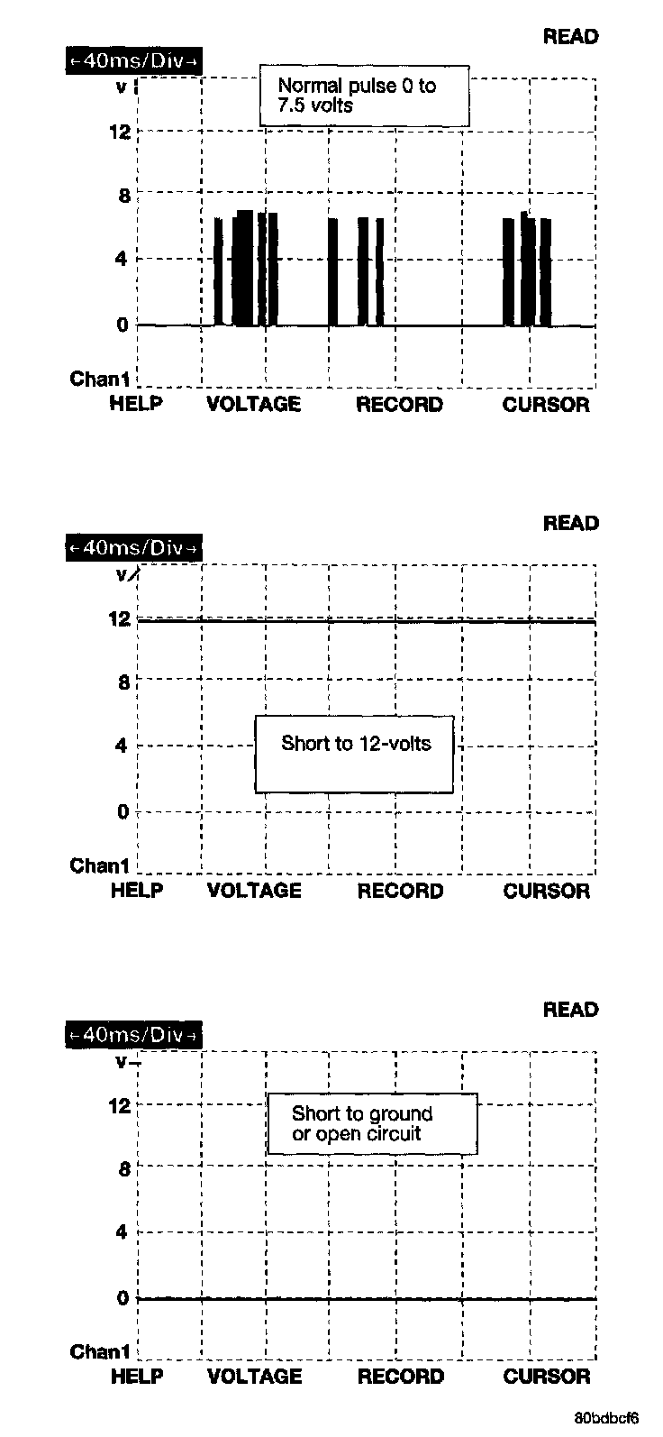 The bus messages are transmitted at a rate averaging 10800 bits per second. Since there is only voltage present when the modules transmit and the message length is only about 500 milliseconds, it is ineffective to try and measure the bus activity with a conventional voltmeter. The preferred method is to use DRBIII(R) lab scope. The 12v square wave selection on the 20-volt scale provides a good view of the bus activity. Voltage on the bus should pulse between zero and about seven and a half volts. Refer to the following figure for some typical displays.