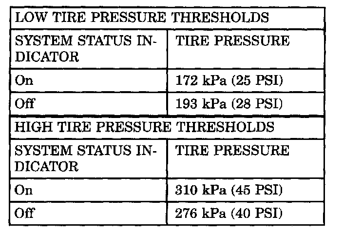 The EVIC will monitor the tire pressure signals from the four (or five) tire sensors and determine if any tire has gone below the low pressure threshold or raised above the high pressure threshold. Refer to the table.