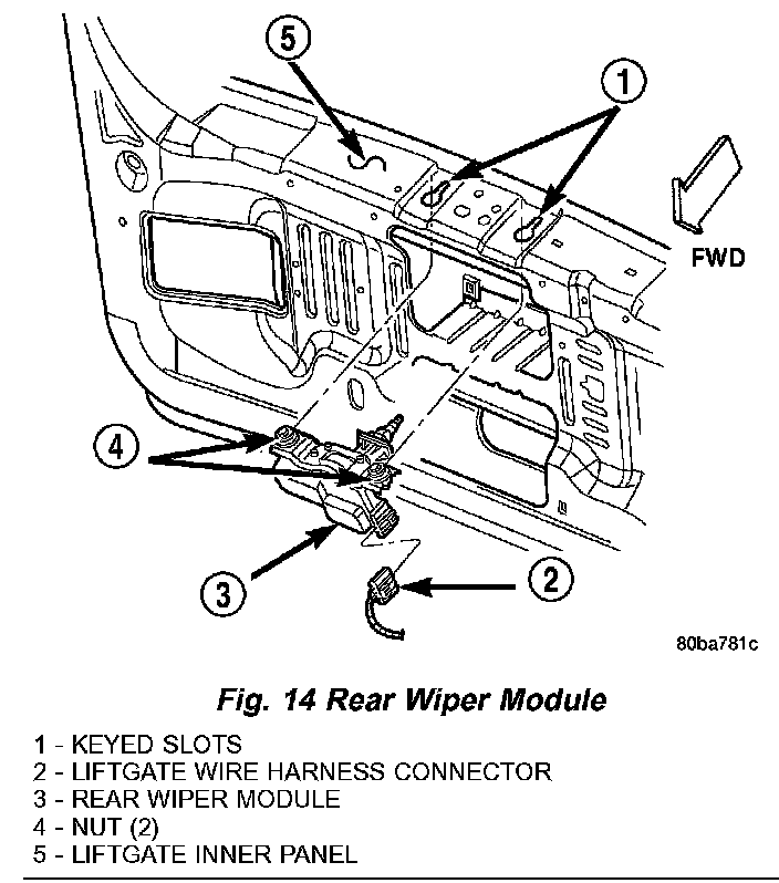 The rear wiper module receives non-switched battery current through a fuse in the Junction Block (JB) on a fused B(+) circuit and is connected to ground at all times. The rear wiper module operation is controlled by the vehicle operator through battery current signal inputs received by the rear wiper module electronic controls from the rear wiper switch circuitry of the right (wiper) multi-function switch on the steering column. The module also receives an external control input from the liftgate flip-up glass ajar switch circuit. If the rear wiper module senses that the flip-up glass is ajar, it will not allow the rear wiper motor to operate.