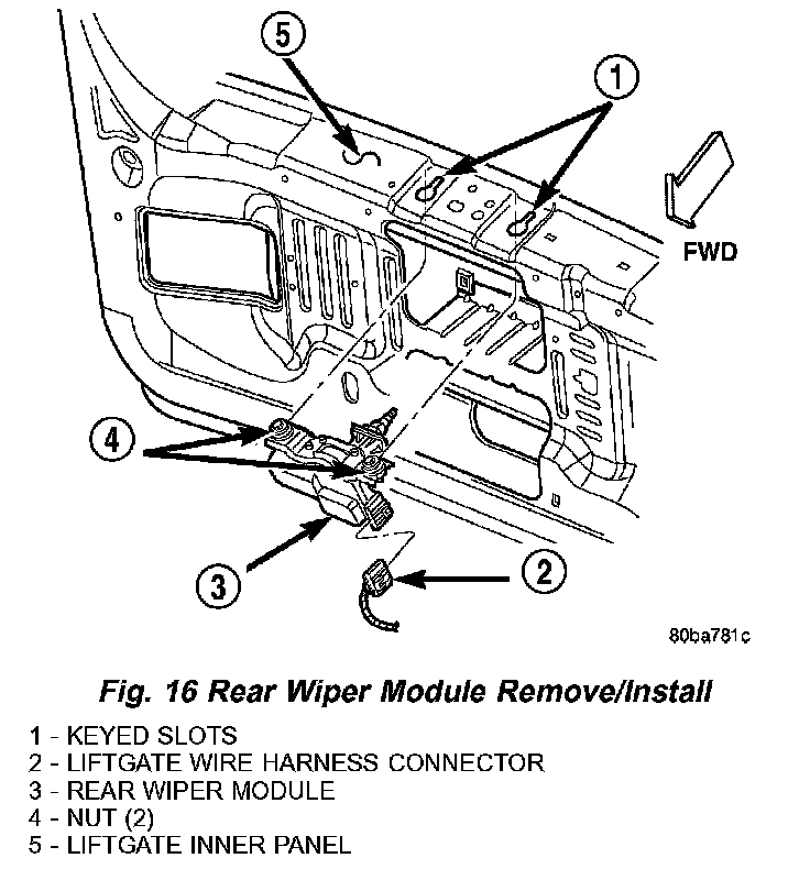 9. Slide the rear wiper module and mounting bracket forward far enough to disengage the mounting nuts from the keyed slots in the top of the lower flip-up glass opening of the liftgate inner panel.