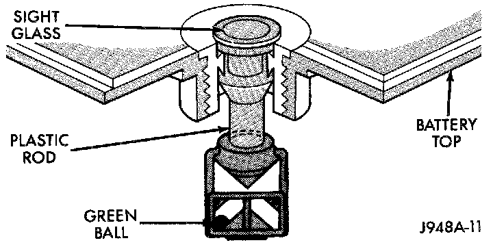 An indicator (hydrometer) built into the top of the battery case provides visual information for battery testing. Like a hydrometer, the built-in indicator measures the specific gravity of the battery electrolyte. The specific gravity of the electrolyte reveals the battery state-of-charge; however, it will not reveal the cranking capacity of the battery A load test must be performed to determine the battery cranking capacity Refer to Standard Procedures for the proper battery load test procedures.